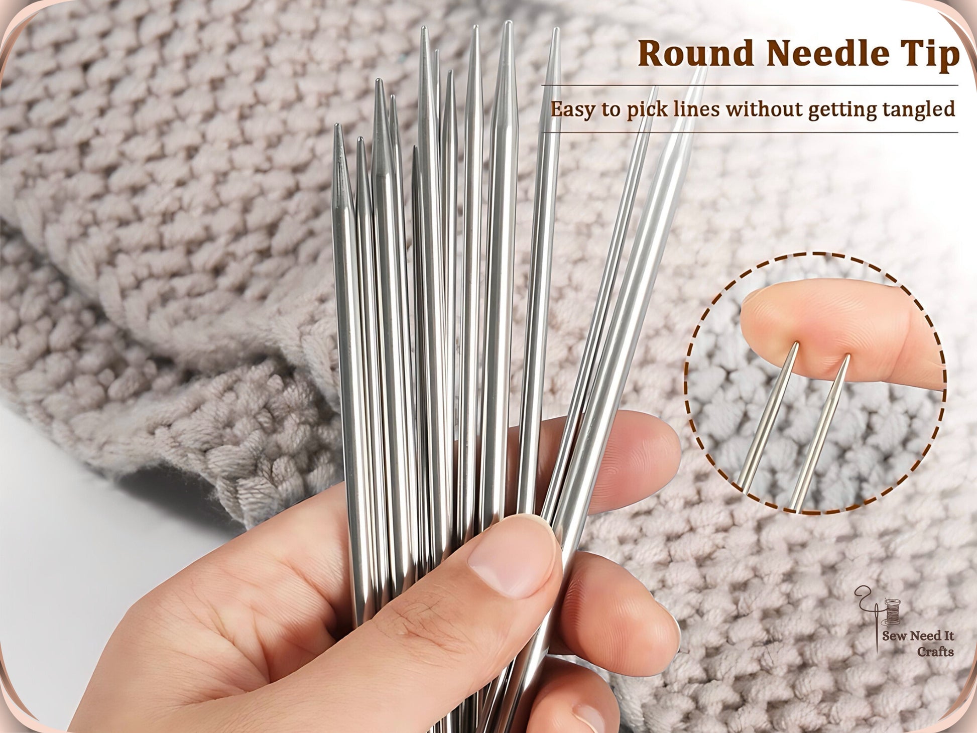 These compact needles glide smoothly through yarn, helping you knit faster with even tension. Strong and durable stainless steel ensures they won’t bend easily, and the rounded tapered tips make it easy to pick up stitches without splitting yarn. Each size comes as a set of 5 needles in a labeled reusable sleeve for simple organization.